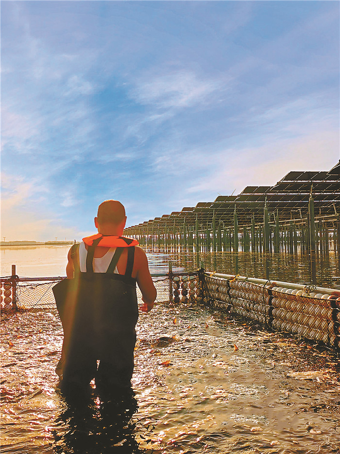 漁光物聯(lián)-漁業(yè)運營部養(yǎng)殖員史居正頂著烈日和熱潮,試用網箱給三標段精養(yǎng)區(qū)運魚苗