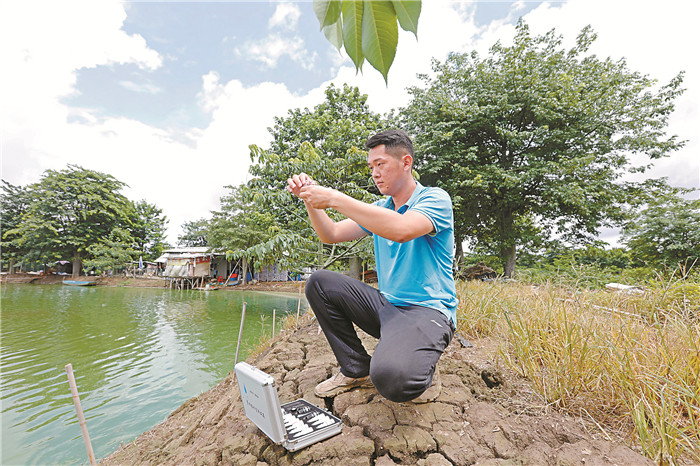 蝦特料片區(qū)陽江海壹一線服務人員頂著40度的高溫為養(yǎng)殖戶測水