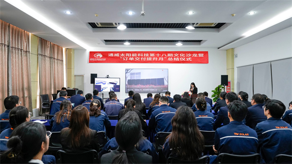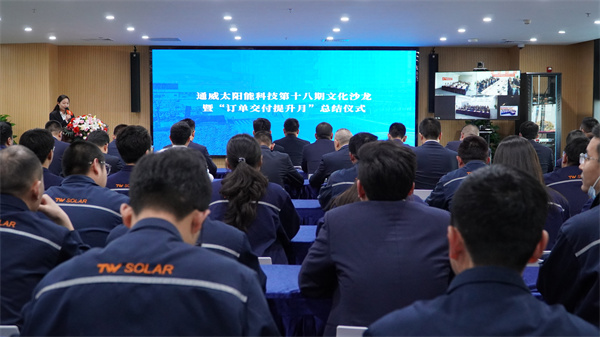本次活動以全體參會人員起立,齊唱《通威之歌》拉開序幕。隨后集體觀看訂單交付主題VCR,短片從供應端、制造端到客戶端全面呈現通威太陽能科技公司各環節的高效協同能力。隨后,計劃運營管理部對2024年“訂單交付提升”工作進行宣貫,分享訂單交付提升月的活動內容與成果,闡釋年度交付目標達成解析與挑戰認知。