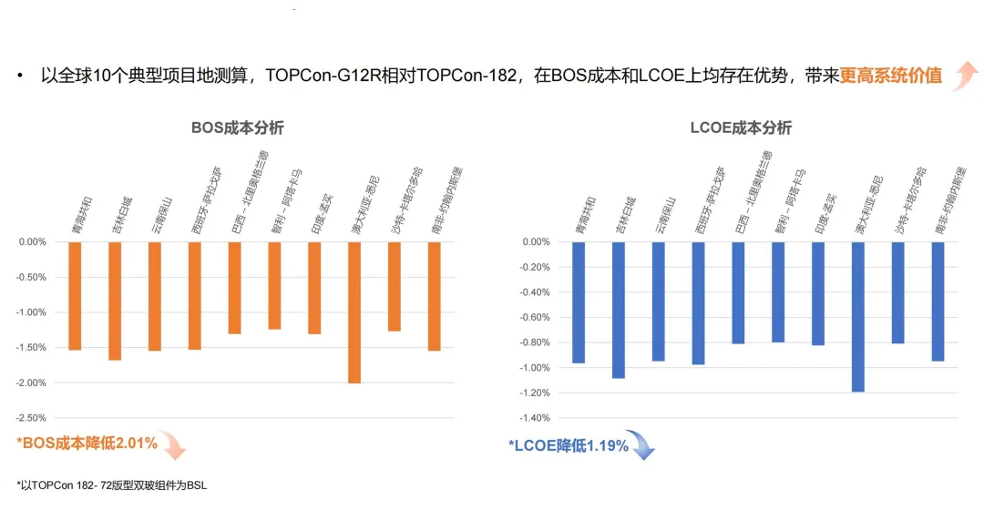 在設(shè)計(jì)方面,TNC-G12R-66組件在寬度維持1134mm的情況下,將長(zhǎng)度由2278mm提升至2382mm,使得安裝更加便捷,集裝箱利用率高達(dá)98.5%,充分利用空間降低運(yùn)輸成本,較182-72組件車裝載量提高4%,顯著降低工商業(yè)、戶用等分布式項(xiàng)目BOS成本。實(shí)證數(shù)據(jù)表明,TNC-G12R組件可降低BOS成本2.01%,降低LCOE 1.19%。